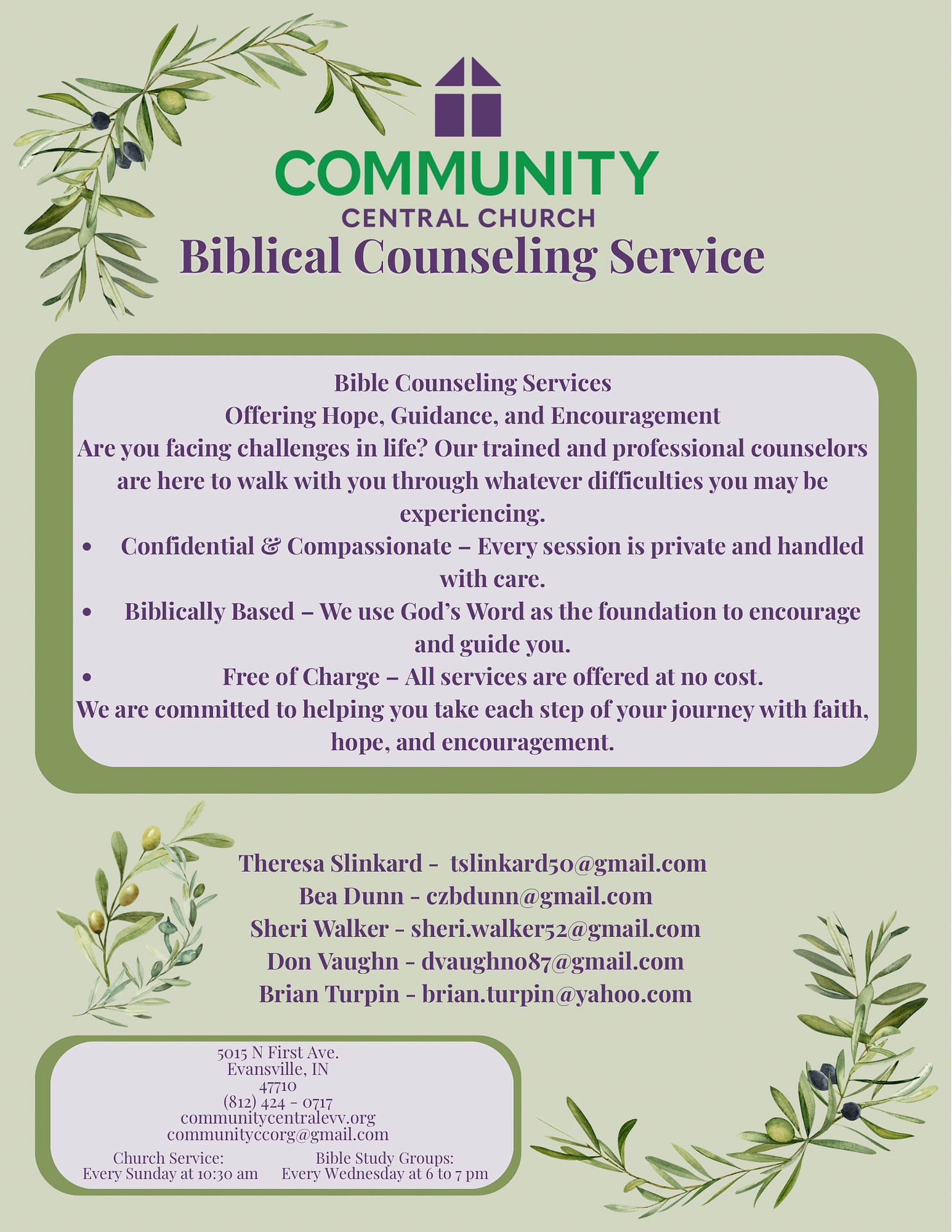 At Community Central Church we offer a Bible Counseling Service to help in whatever difficulties you may be facing. Our counselors are trained and professional, making sure every visit remains confidential. We use God’s Word as our focus in helping guide our clients in every step of their journey, whatever they may be. ALL services are free. For more information and to make an appointment: